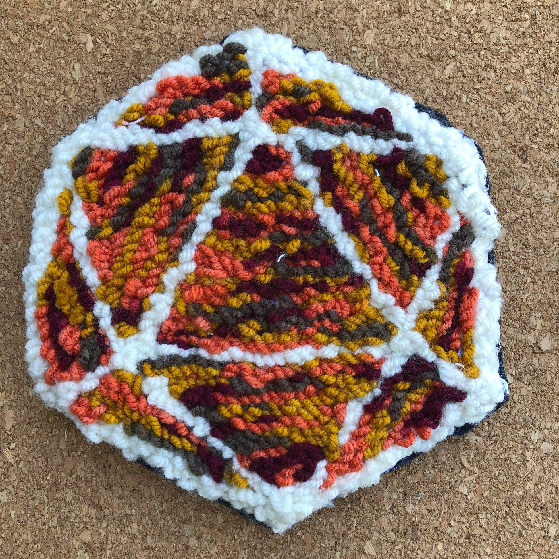 Mug rugs can be used as coasts, hot pads, and wall hanging with the easy addition of a loop on the back. Each D20 is about 6 inches in diameter.
